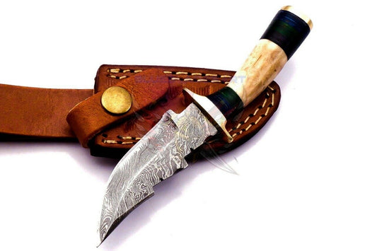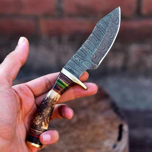 Custom Handmade Damascus Steel Skinning Knife with Deer Antler Handle