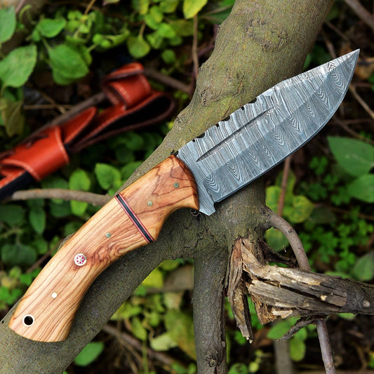 Custom Damascus Fixed Blade Knife with Olive Wood